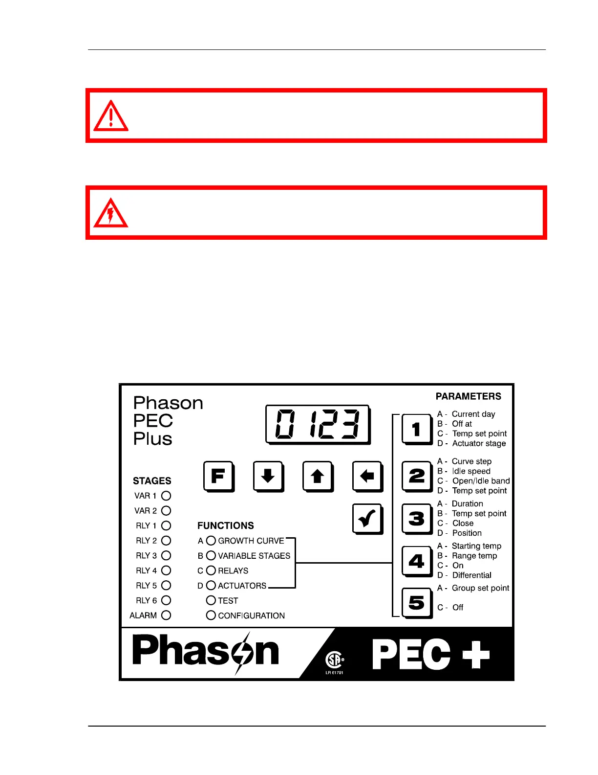 The PEC Plus has a four-character LED display, status LEDs for each variable stage and relay,