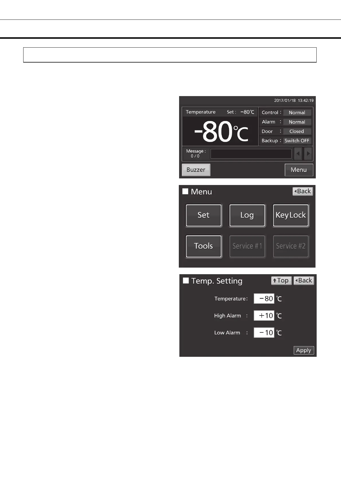 Set the Temperature, High Alarm and Low Alarm for normal operation according to the following