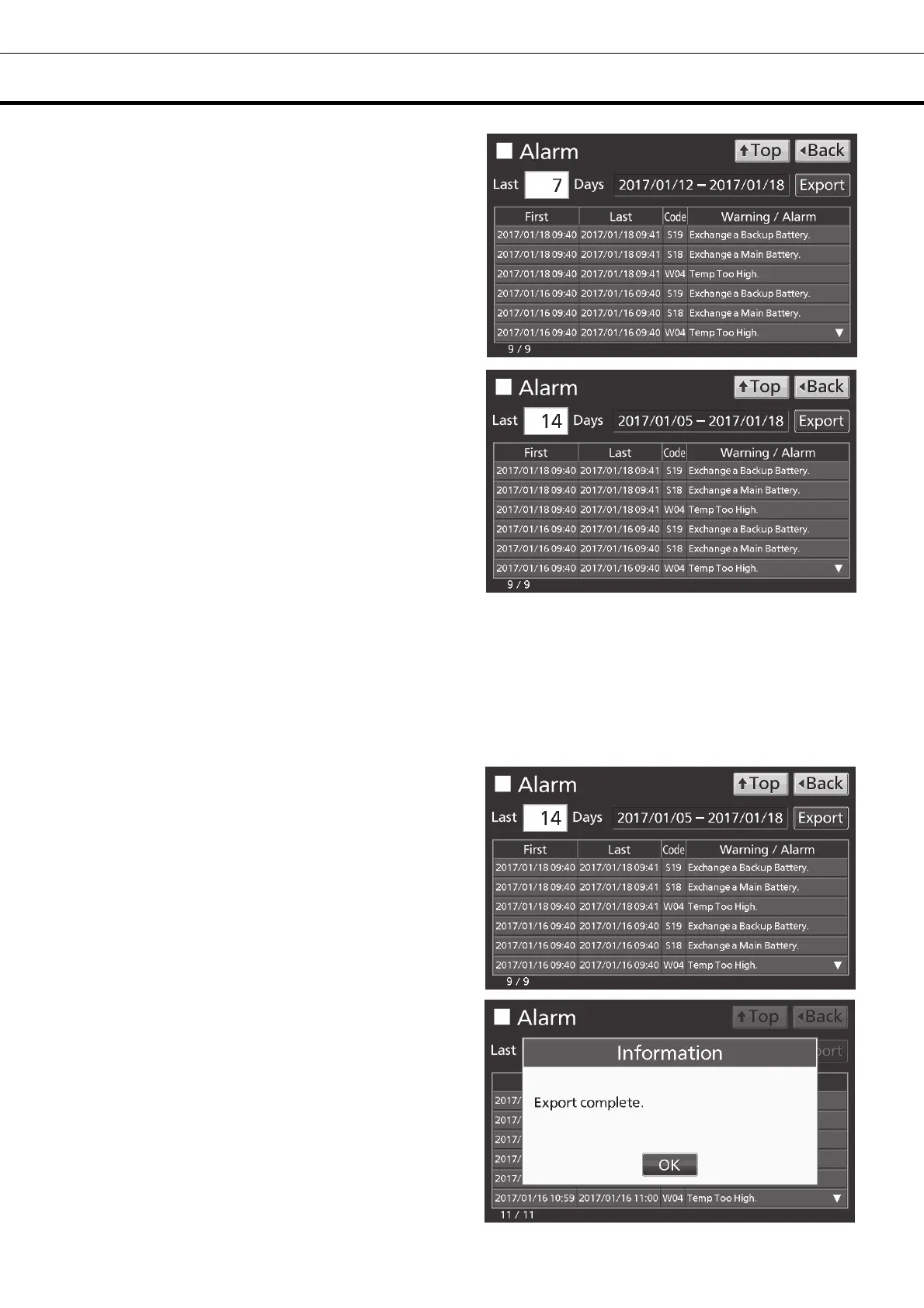 ●On the Alarm screen of procedure 4 or 5, alarm log data can be exported in CSV format to the USB
