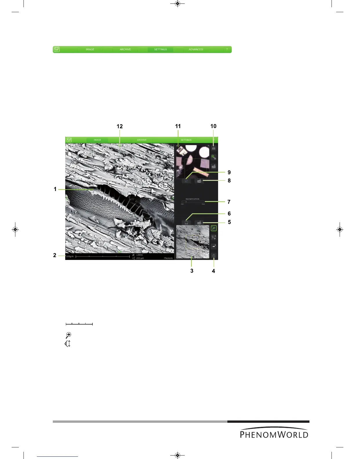 The Image screen is used to view samples, take pictures, and operate the Phenom.