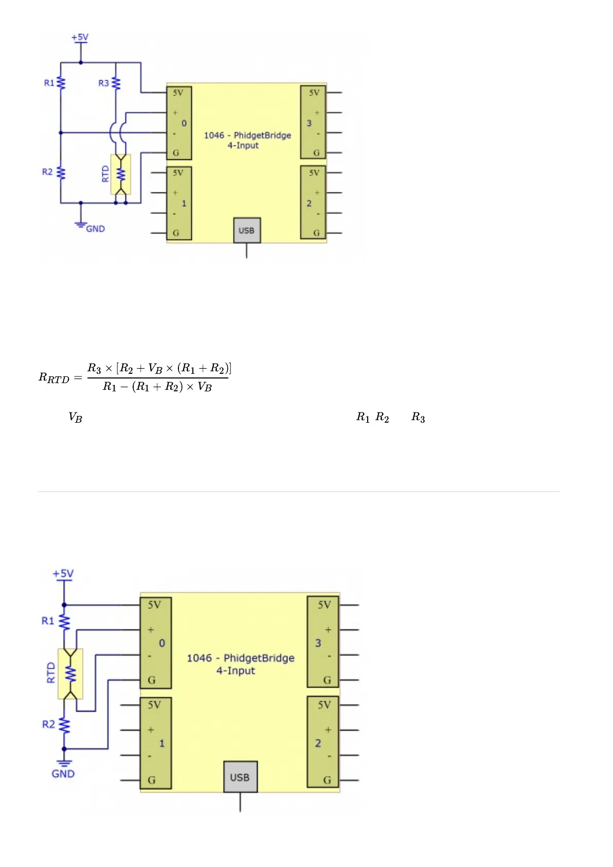 across the RTD is measured. Using the voltage drop and the values of the two resistors, the resistance of the RTD can