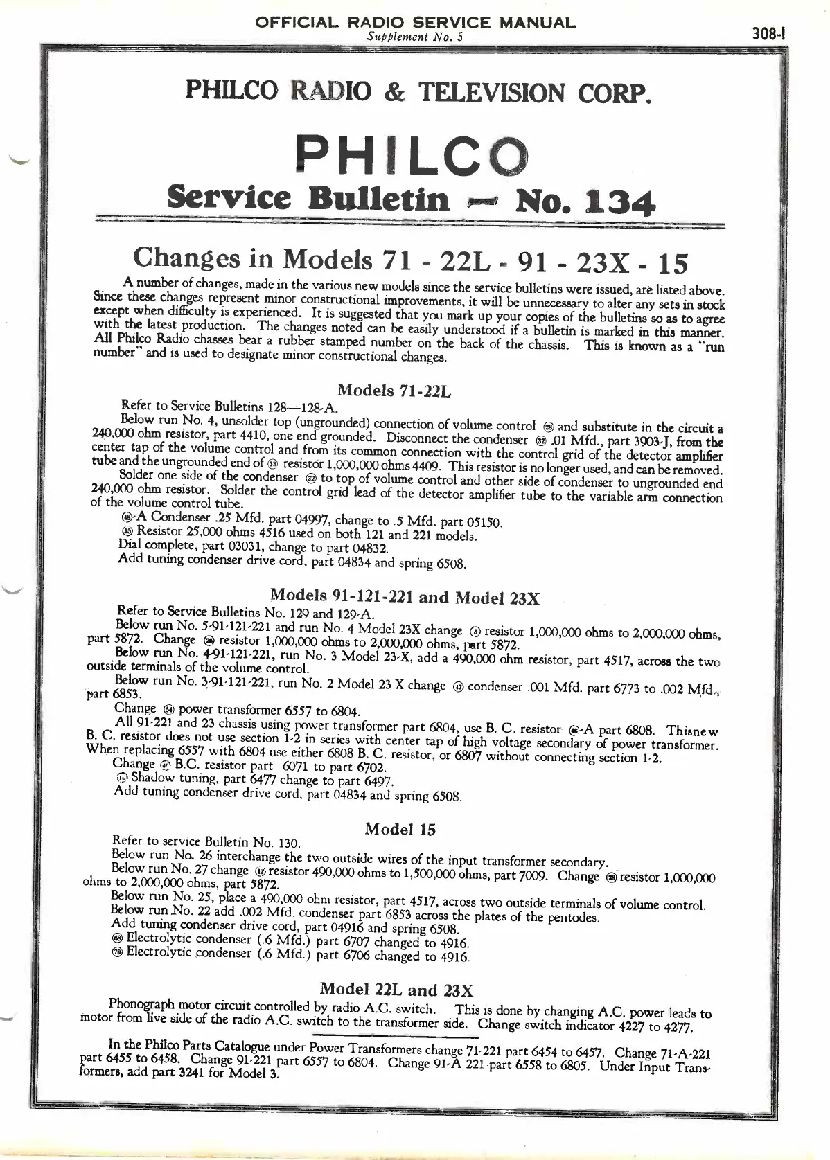 In the Philco Parts Catalogue under Power