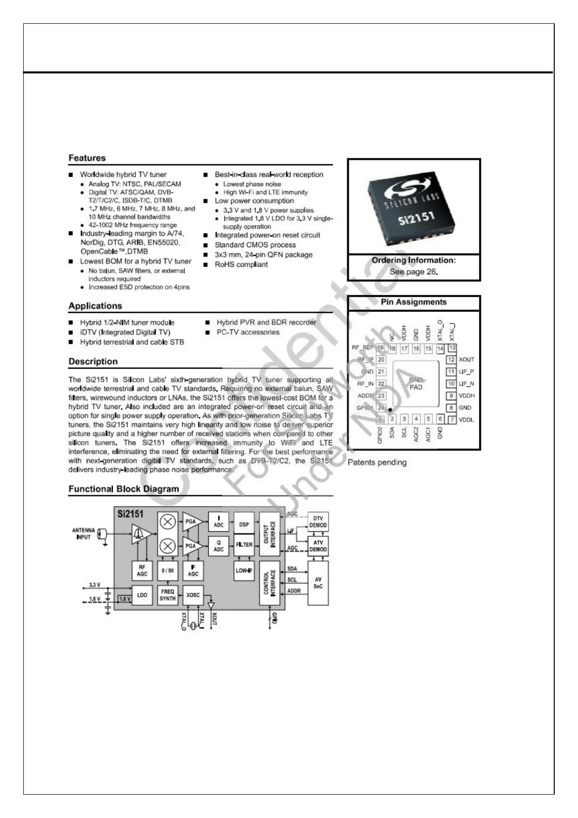 Philco 7M31B - RF Controller: SI2151-A10; Functional Block Diagram; Pin Assignments