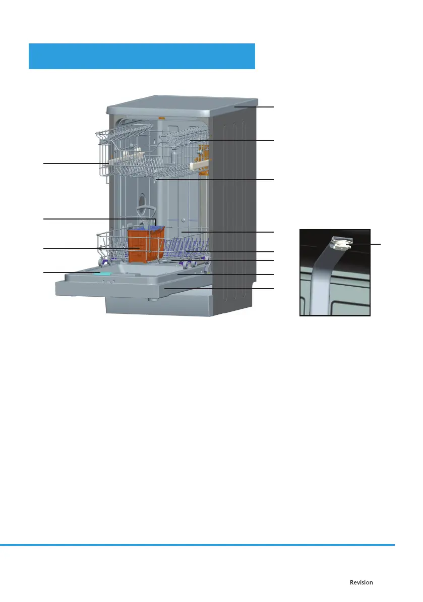 2. Upper rack with cup shelf 9. Detergent and rinsing aid compartment