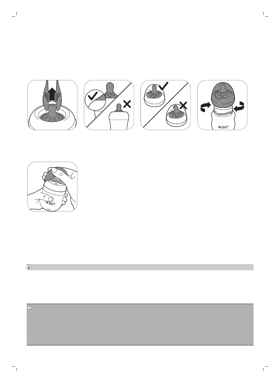 Inspect the bottle and feeding teat before each use and pull the feeding teat in all directions to
