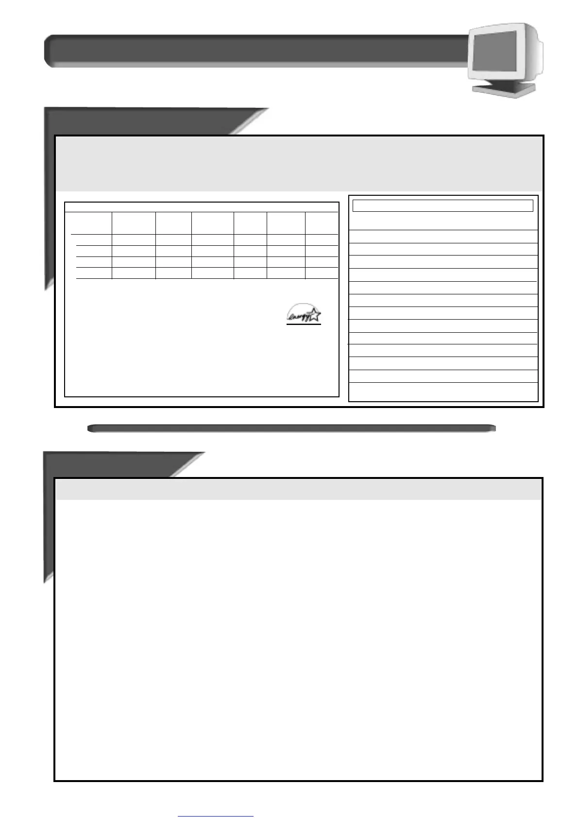 not in use. If input from a keyboard, mouse, or other device is detected, the monitor automatically “wakes up.” The table at left shows the power