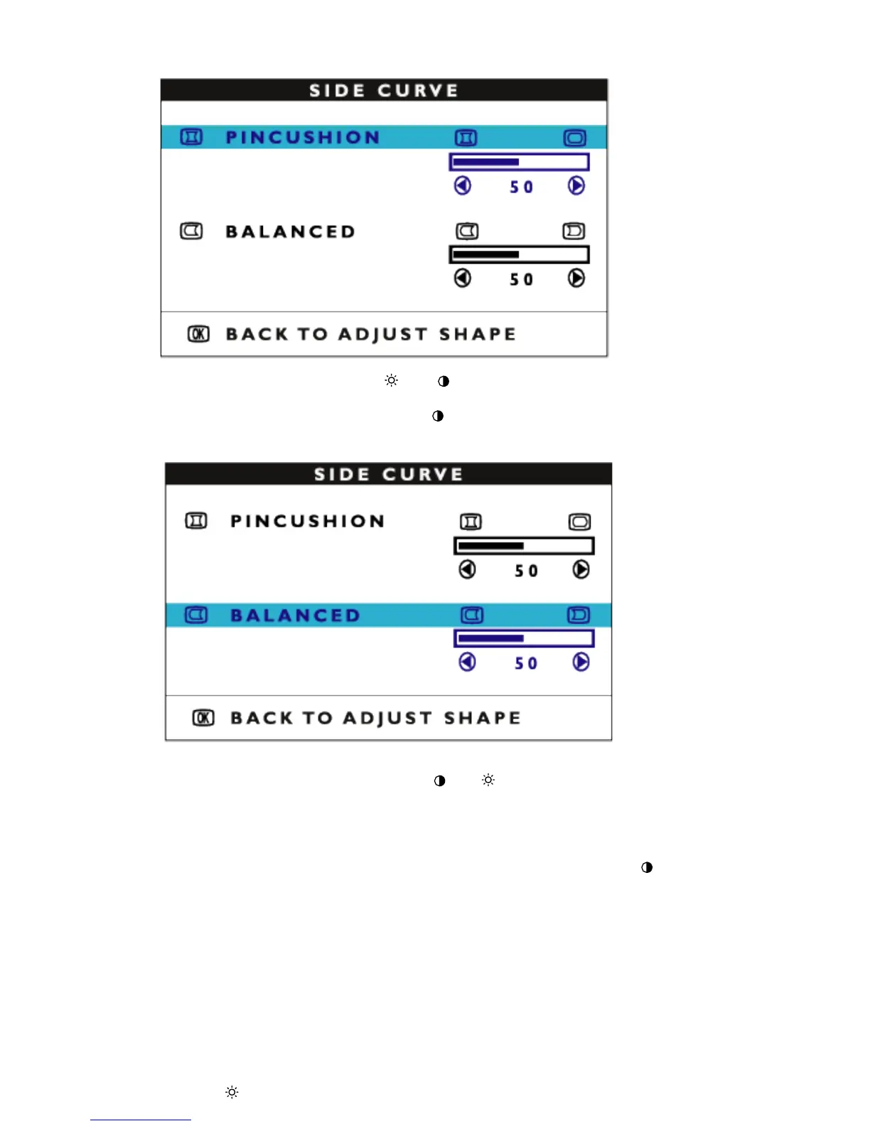 7) To adjust the balanced pincushion, press the (-) or (+) button.Press MENU to confirm.