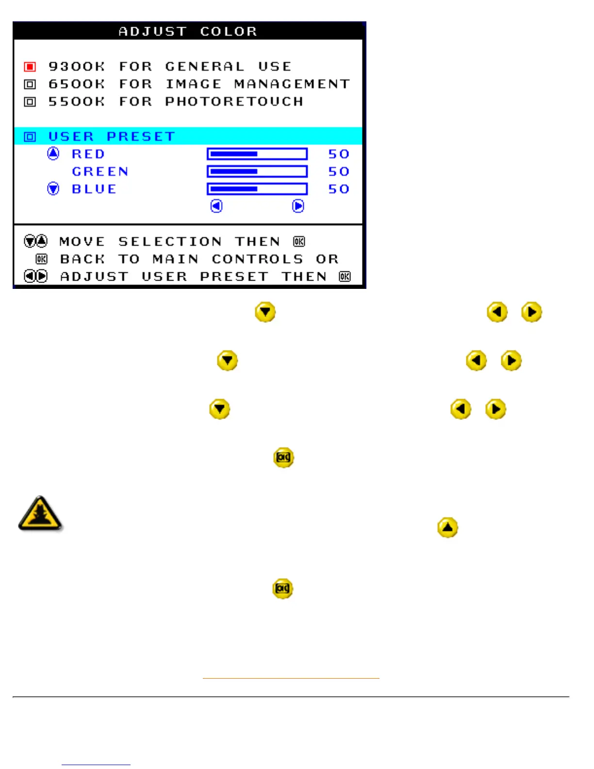 6a) If USER PRESET is highlighted, press the button to highlight RED. Next, press the or