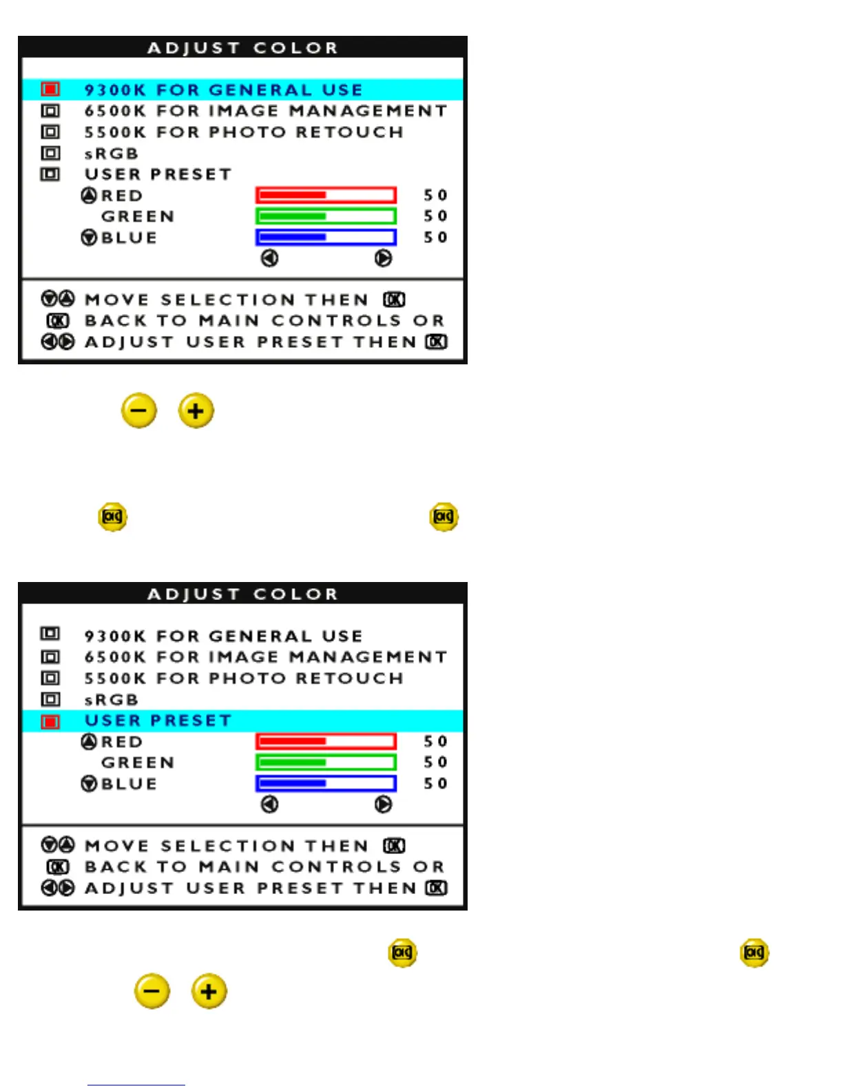 4) Press the or button to highlight 9300K for GENERAL USE, 6500K for IMAGE