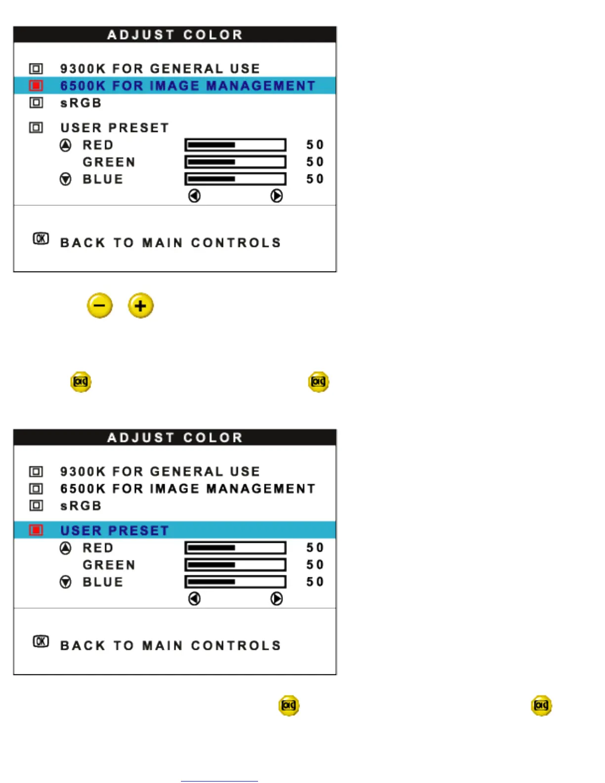 4) Press the or button to highlight 9300K for GENERAL USE, 6500K for IMAGE