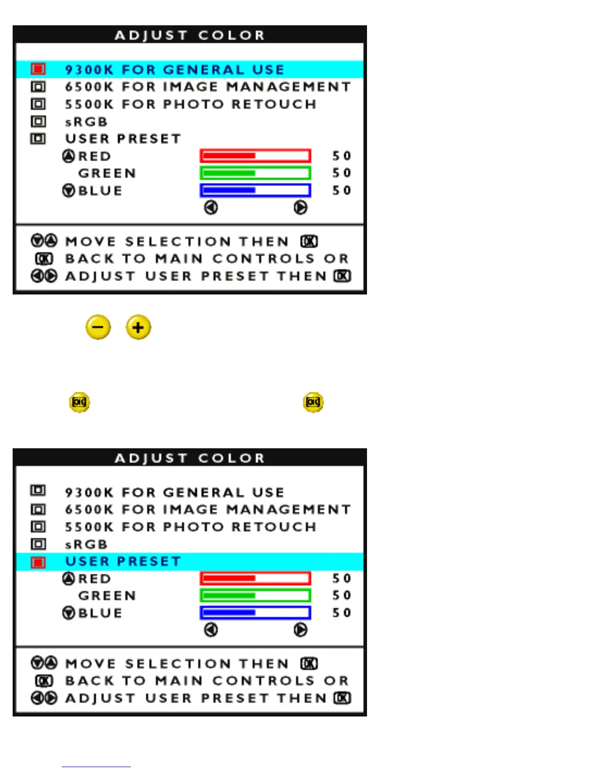 4) Press the or button to highlight 9300K for GENERAL USE, 6500K for IMAGE
