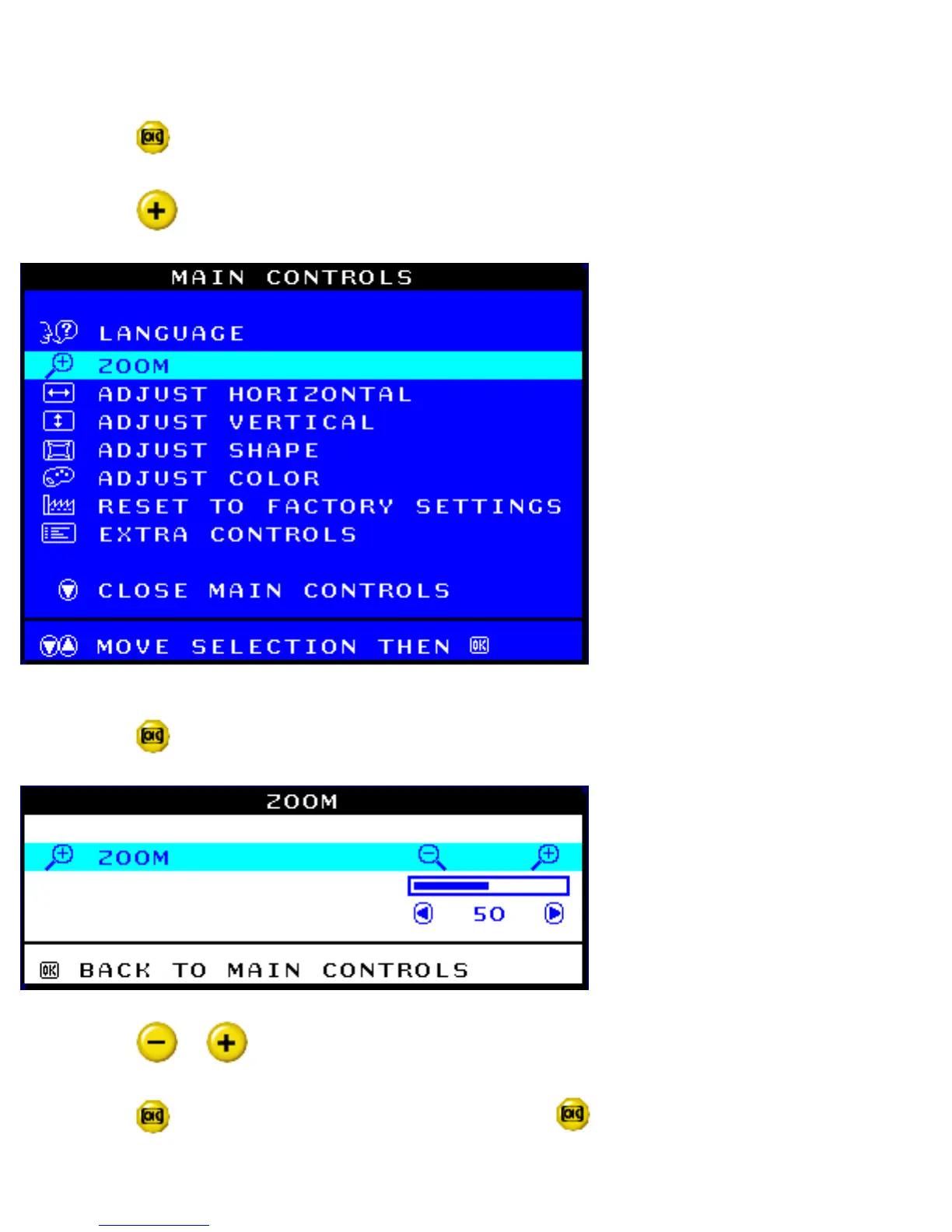 ZOOM increases or decreases the size of the images on your screen. To adjust the ZOOM follow