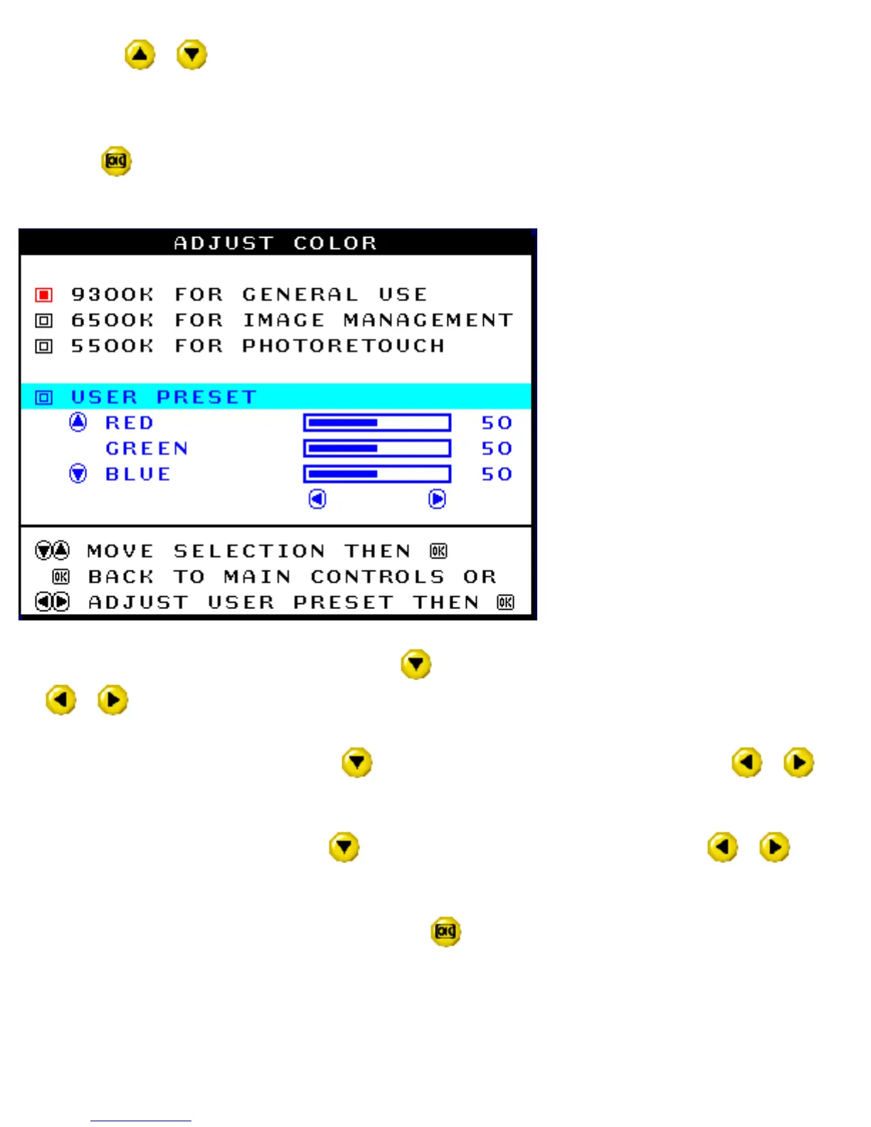 4) Press the or button to highlight 9300K for GENERAL USE, 6500K for IMAGE