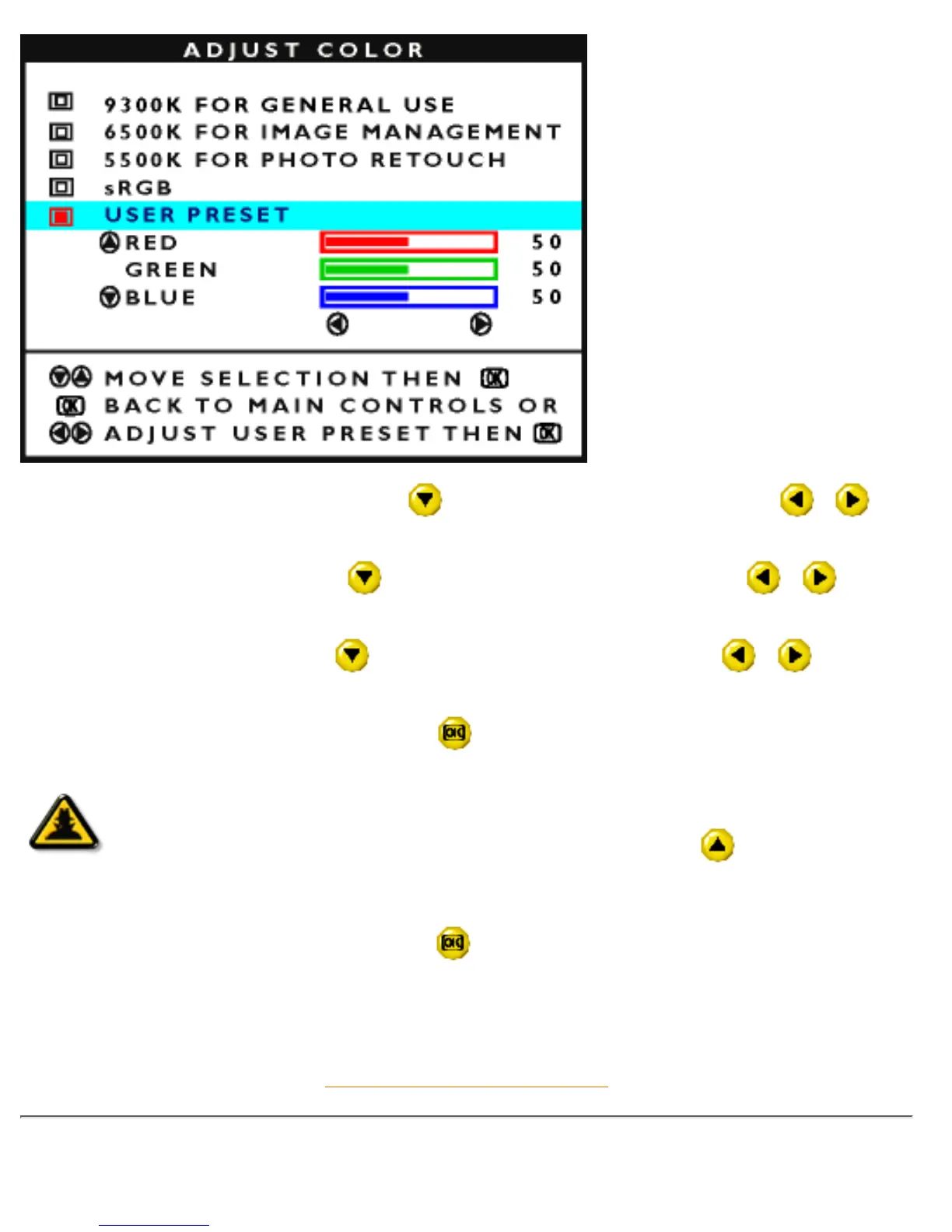 6a) If USER PRESET is highlighted, press the button to highlight RED. Next, press the or