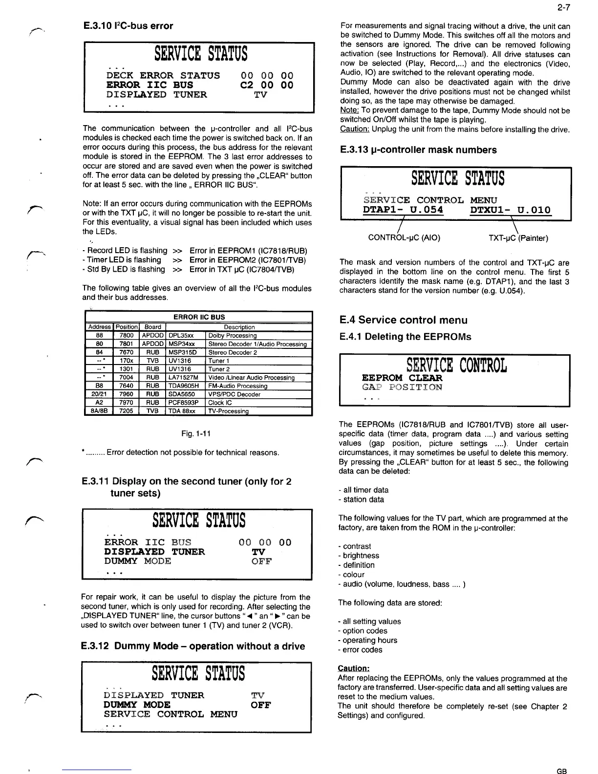 Philips 14PV210 - Service Control Menu; Deleting the Eeproms; I2 C-Bus Error; Display on the Second Tuner