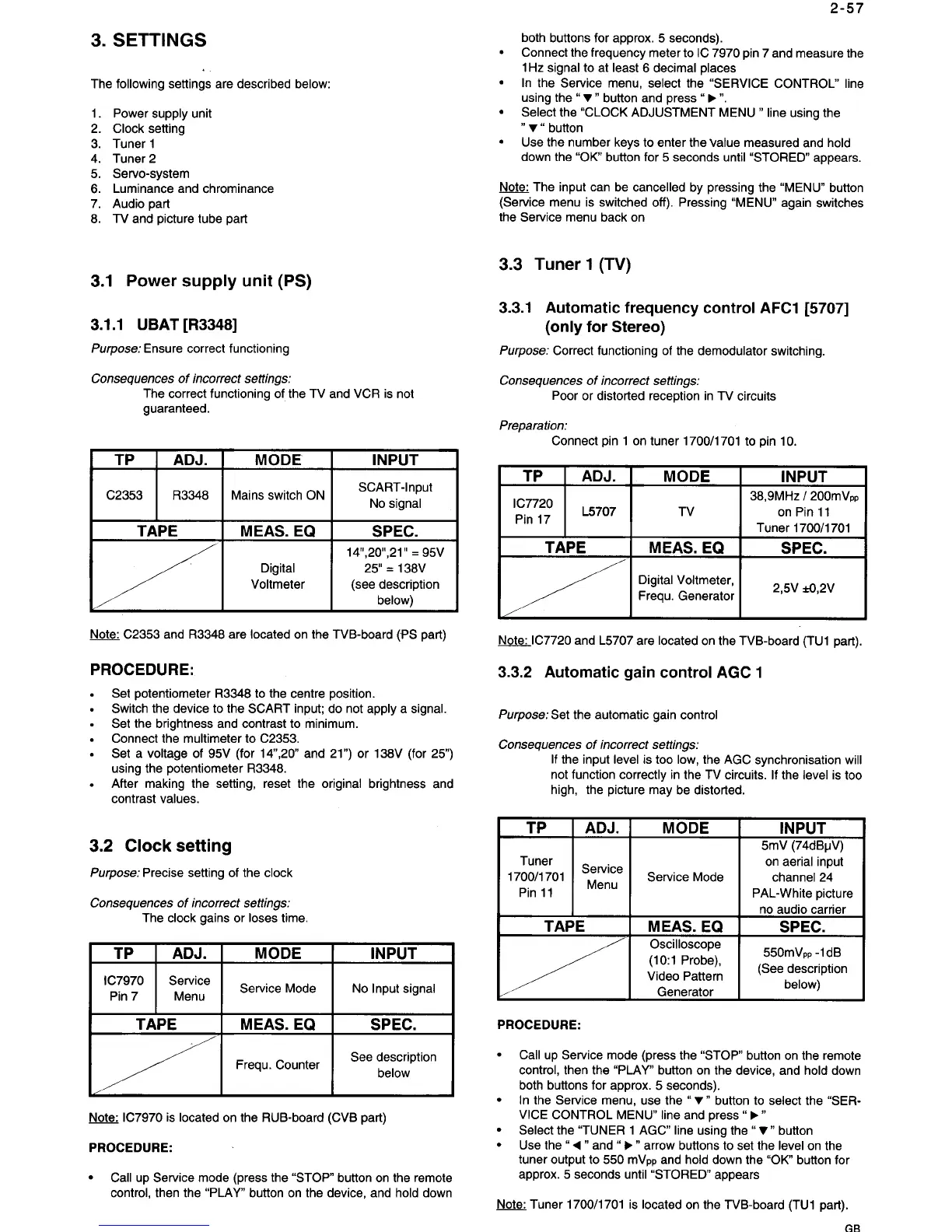 Philips 14PV210 - Settings; Power Supply Unit (PS); Clock Setting; Tuner 1 (TV)