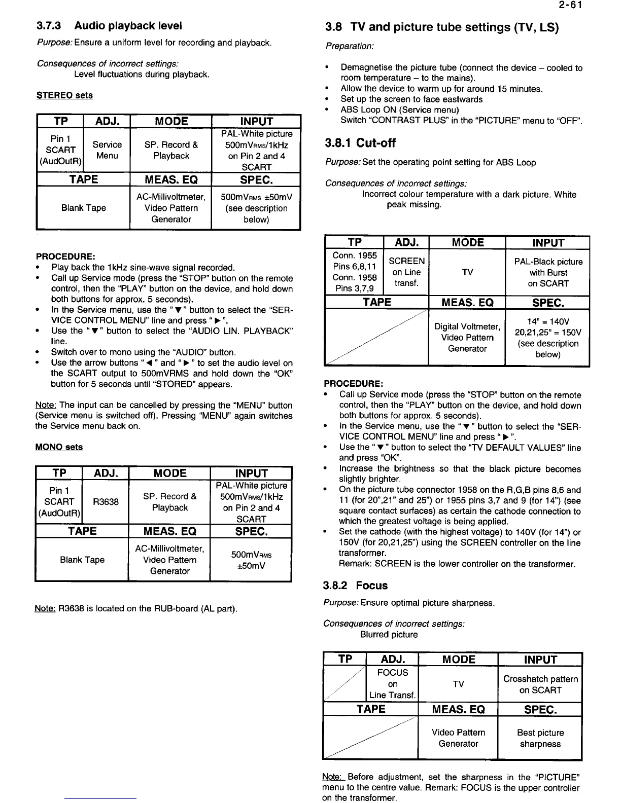 Philips 14PV210 - TV and Picture Tube Settings; Cut-Off; Focus; Audio Playback Level