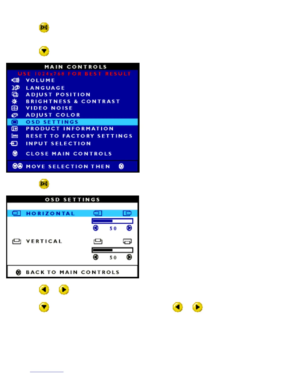 3) Press the button. The OSD SETTINGS window appears. HORIZONTAL is highlighted.