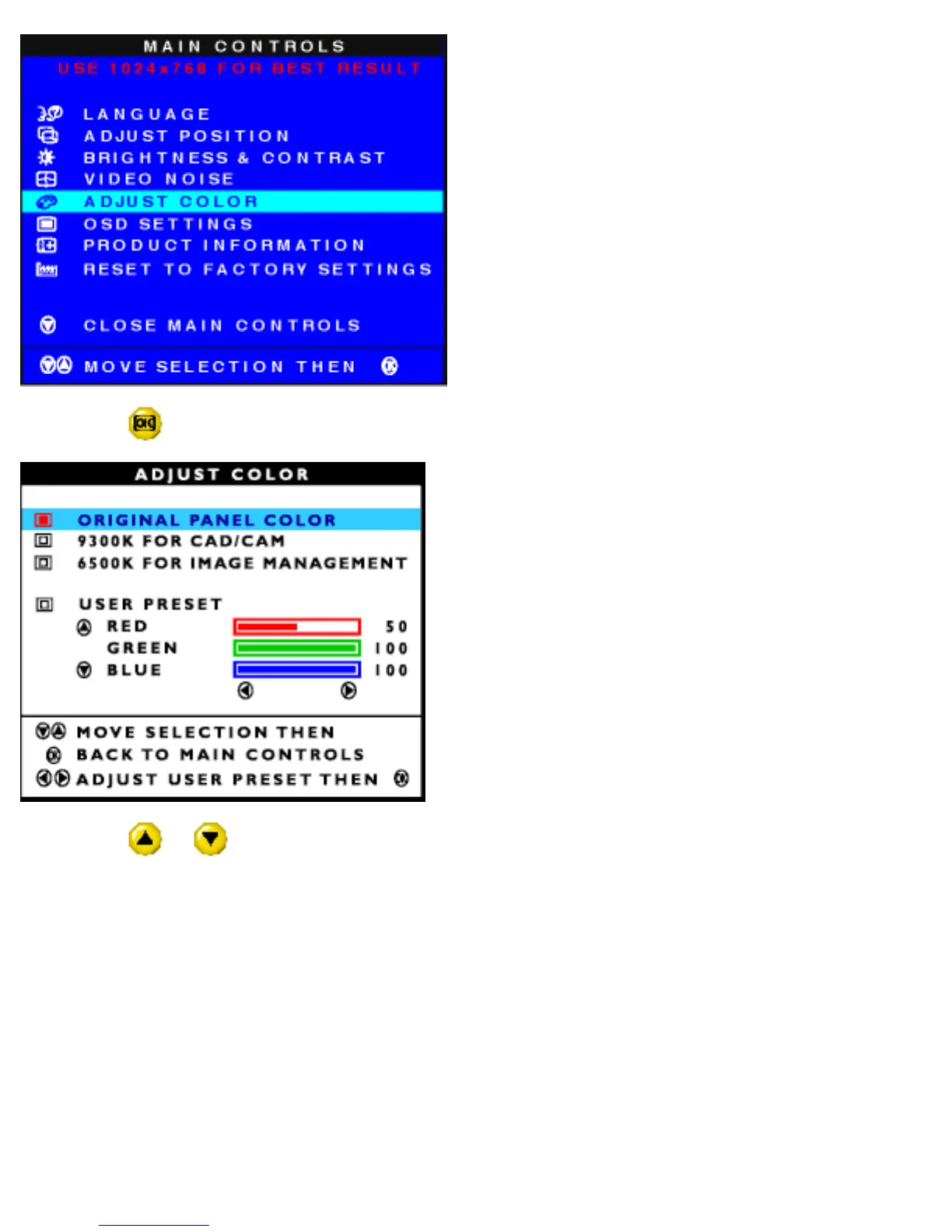 4) Press the or button to select ORIGINAL PANEL COLOR, 9300K FOR CAD/CAM, 6500K FOR