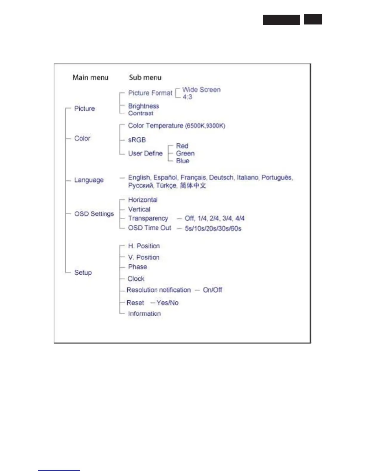 Below is an overall view of the structure of the On-Screen Display. You can use this as a reference when you want