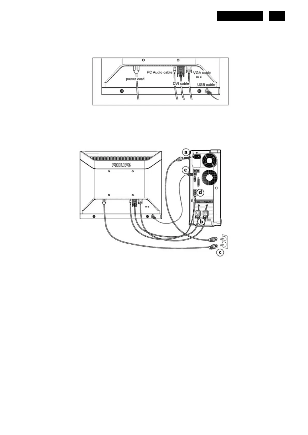 1) Connect the power cord to the back of the monitor firmly. (Philips has pre-connected VGA cable for the first