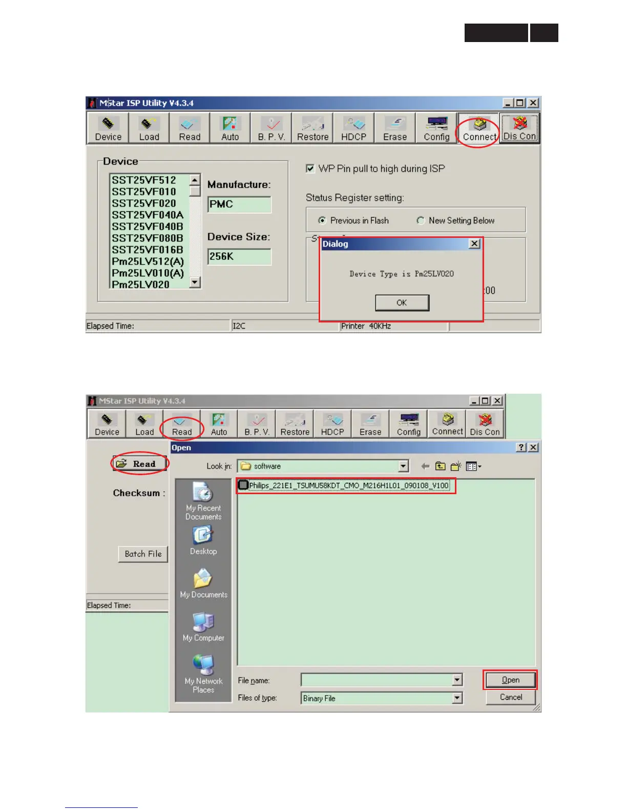 4. Select the “Connect” item, if it connect successfully, it will show “Device Type is Pm25LV020”, and then click
