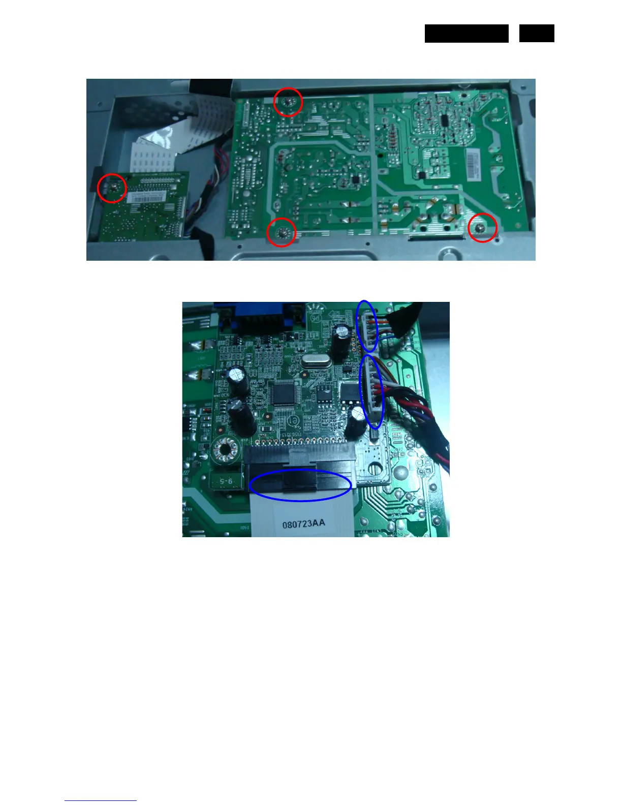 A. Remove four screws marked in red to remove the Power Board and Main Board from Main Frame.