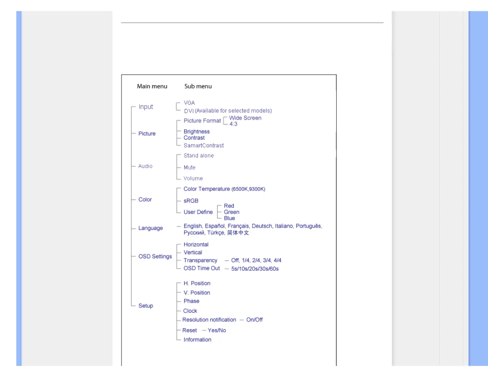 Below is an overall view of the structure of the On-Screen Display. You can use this as a reference when you want to