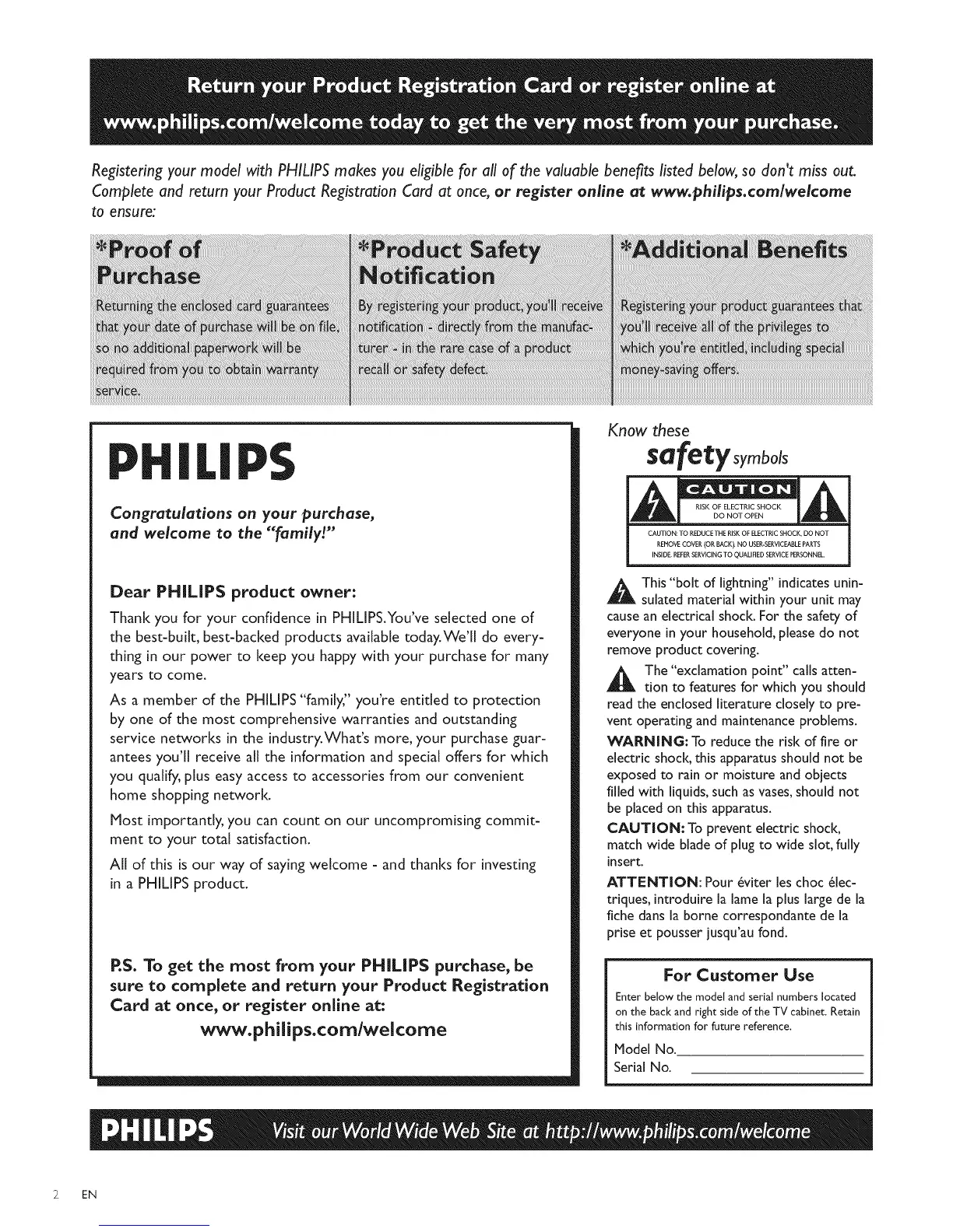 Complete and return your Product Registration Card at once, or register online at www.philips.comlwelcome