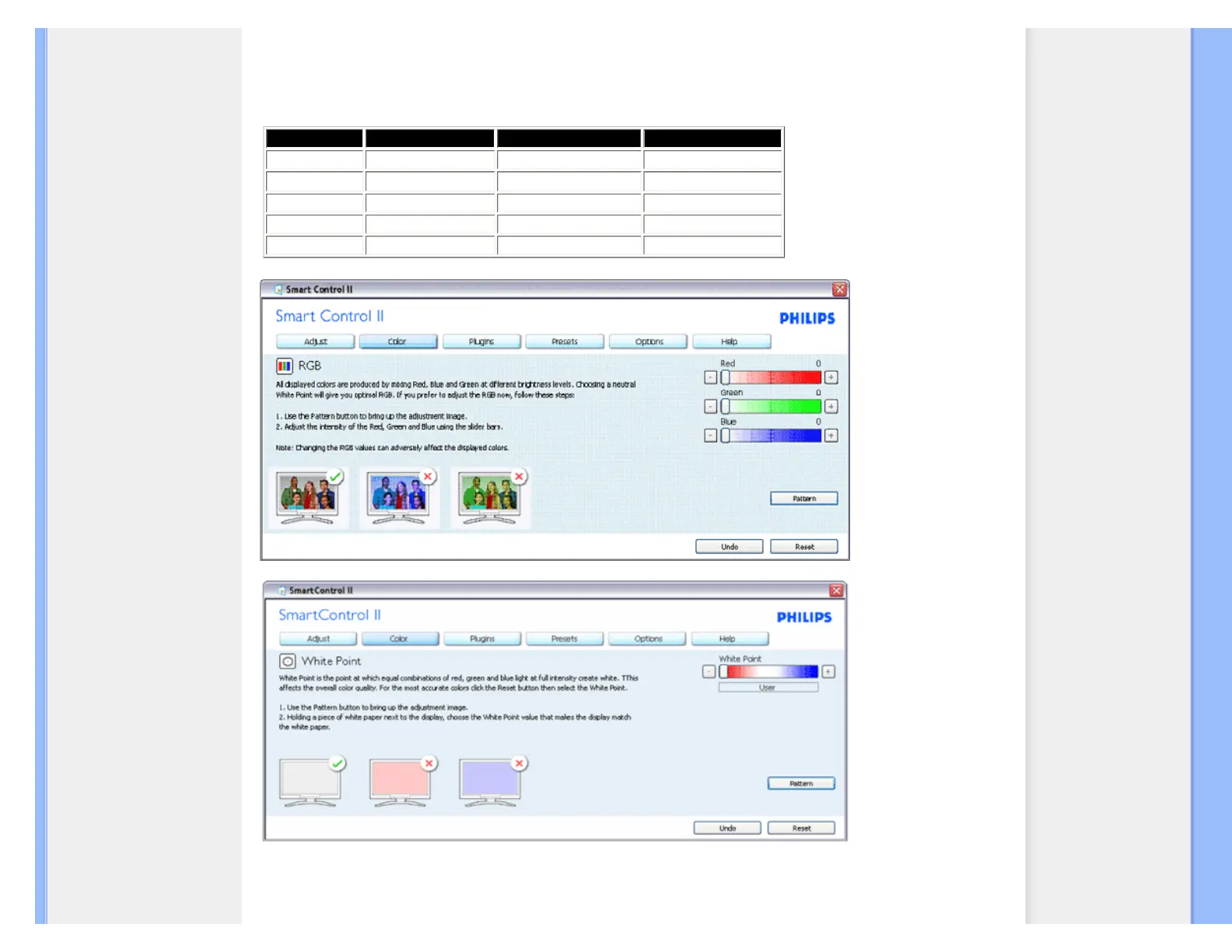 ● Color Menu allow you to adjust RGB, Black Level, White Point, Color Calibration, and