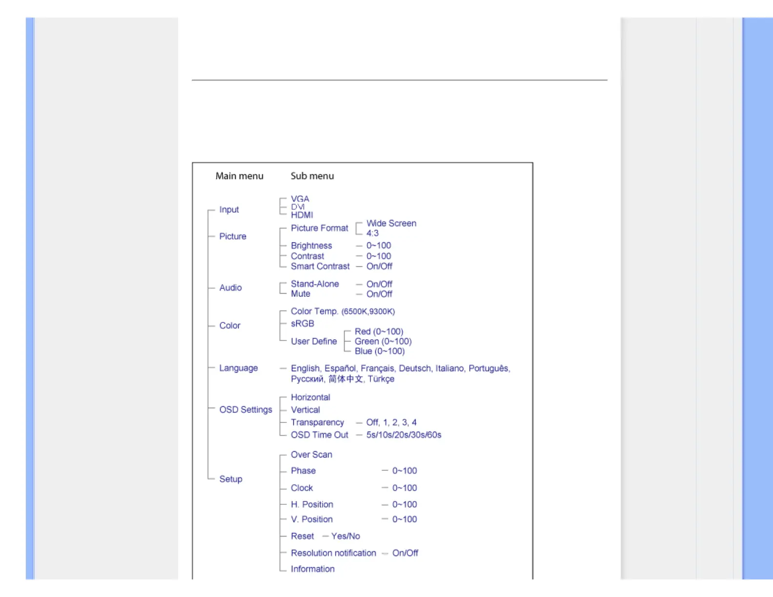 Below is an overall view of the structure of the On-Screen Display. You can use this as a reference