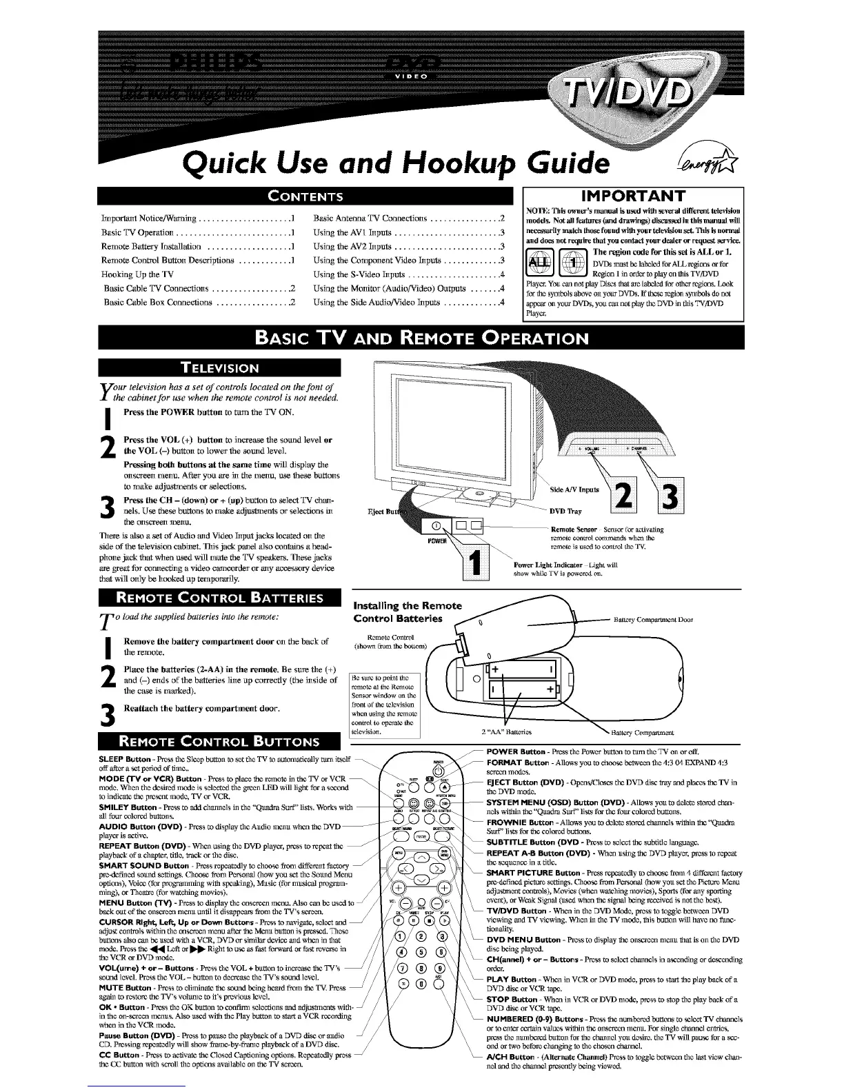 Remote Control Button Descriptions ............ 1