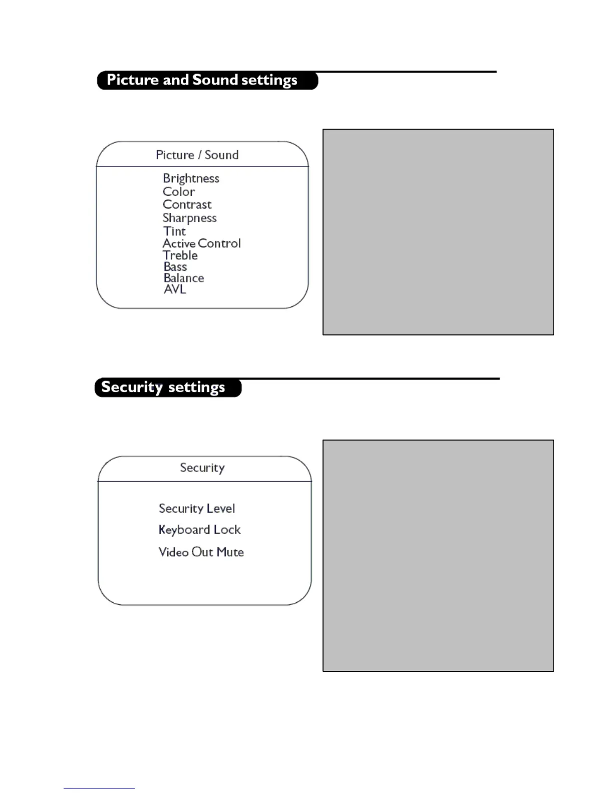 In this sub menu, the Picture and Sound settings of the TV can be configured.