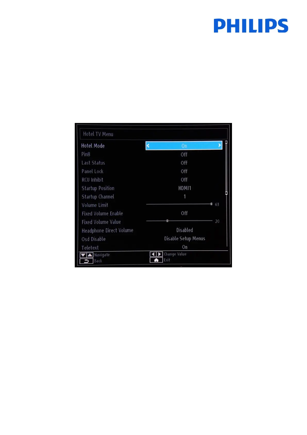 arrow buttons. Set the Hotel TV Mode to OFF.