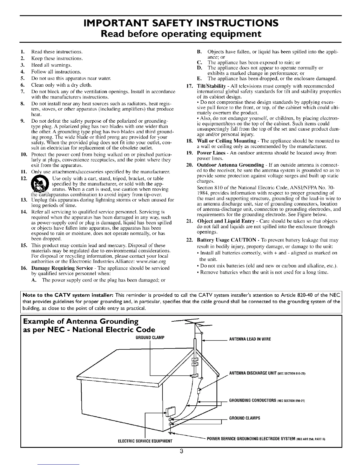 Note to the CATV system installer: This reminder is provided to call the CATV system installer's attention to Article 820-40 of the NEC