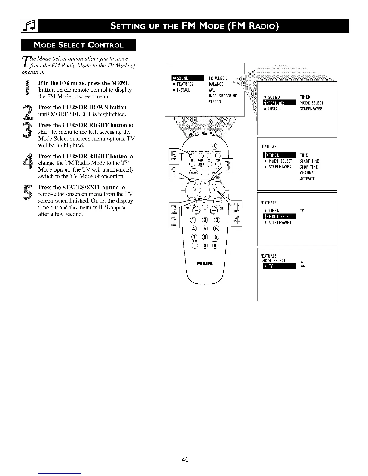 Pre_s the CURSOR RIGHT button tochange the FM Radio Mode to the TV