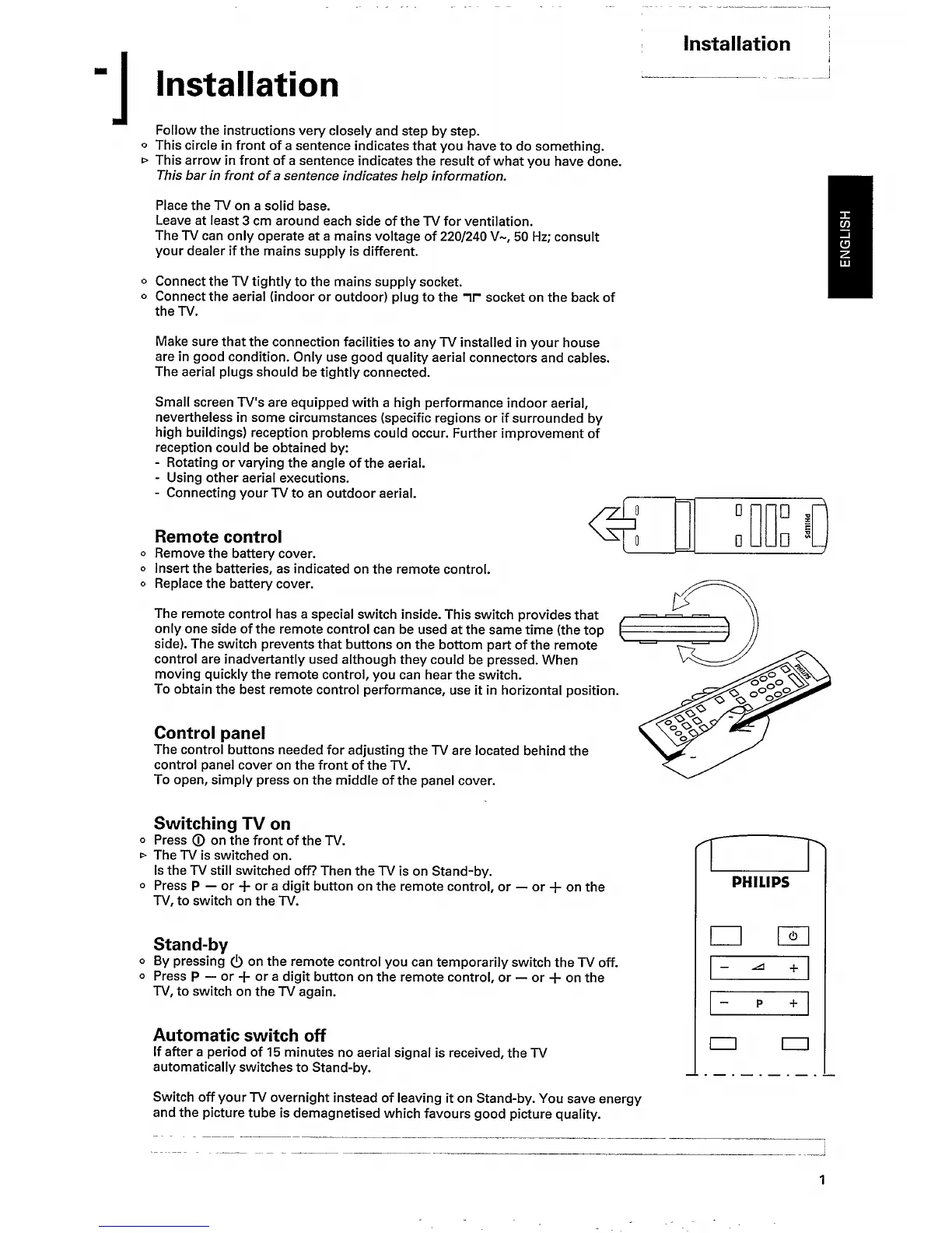 Philips 21PT161B/05 - Installation; Remote Control; Control Panel; Switching TV on