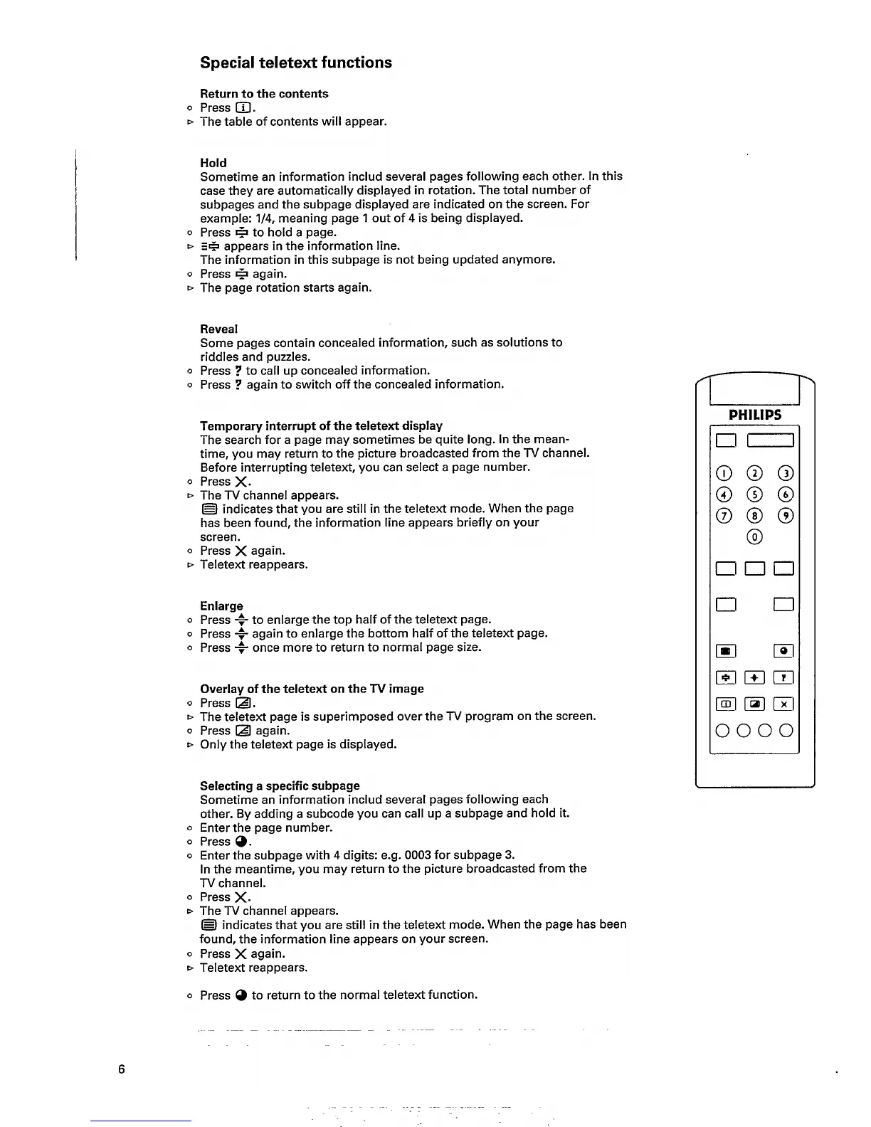 Philips 21PT161B/05 - Special Teletext Functions; Hold; Reveal; Enlarge