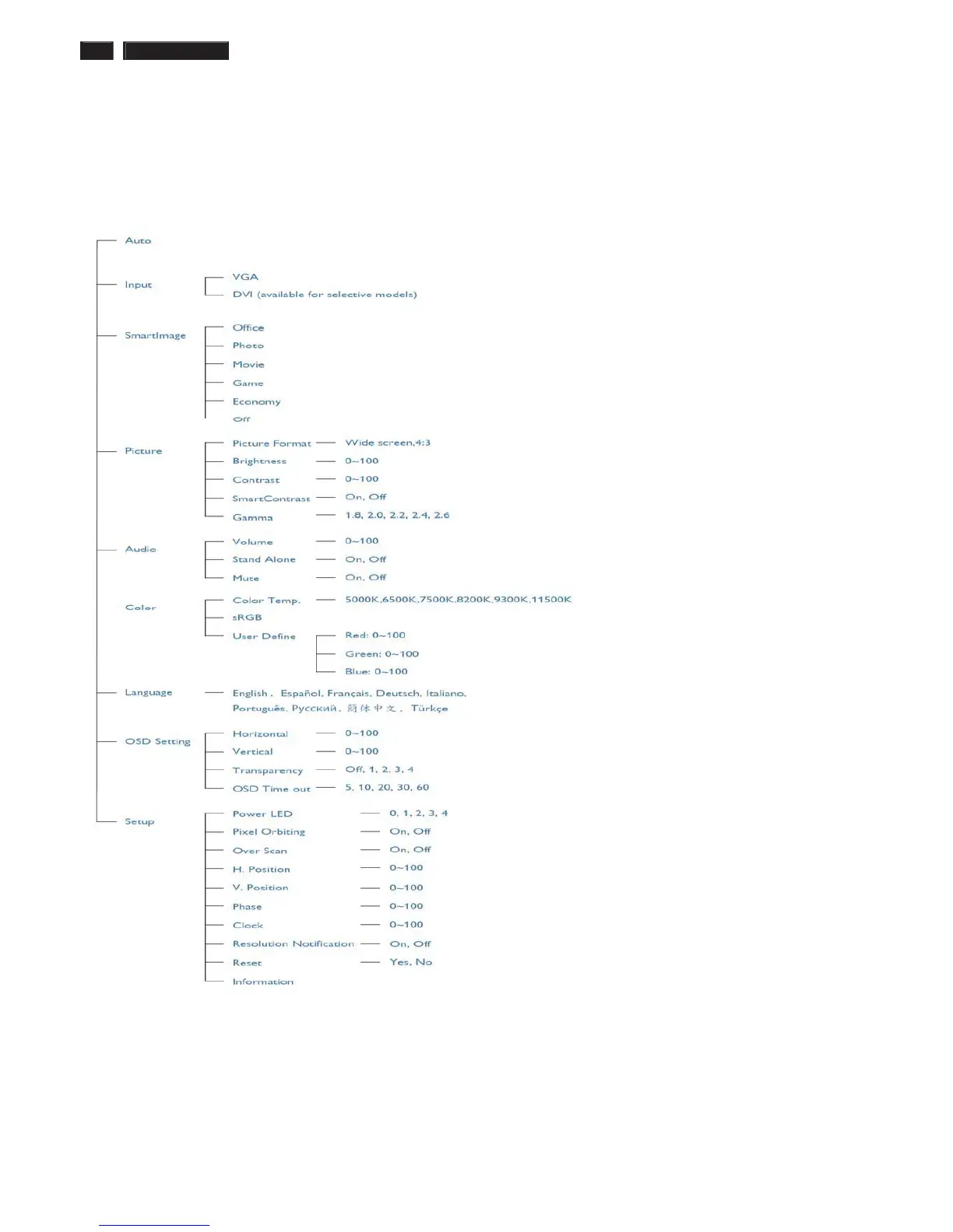 Below is an overall view of the structure of the On-Screen Display. You can use this as a reference when you want to work
