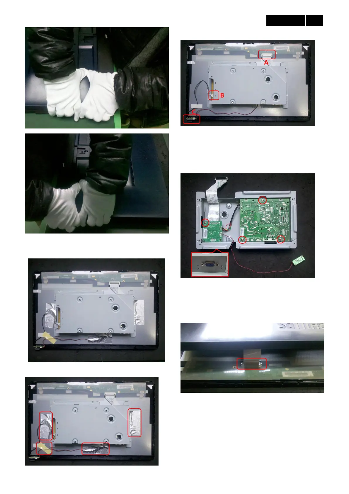 6. Take off FFC (A), light PIN (B) and Key Board(C).