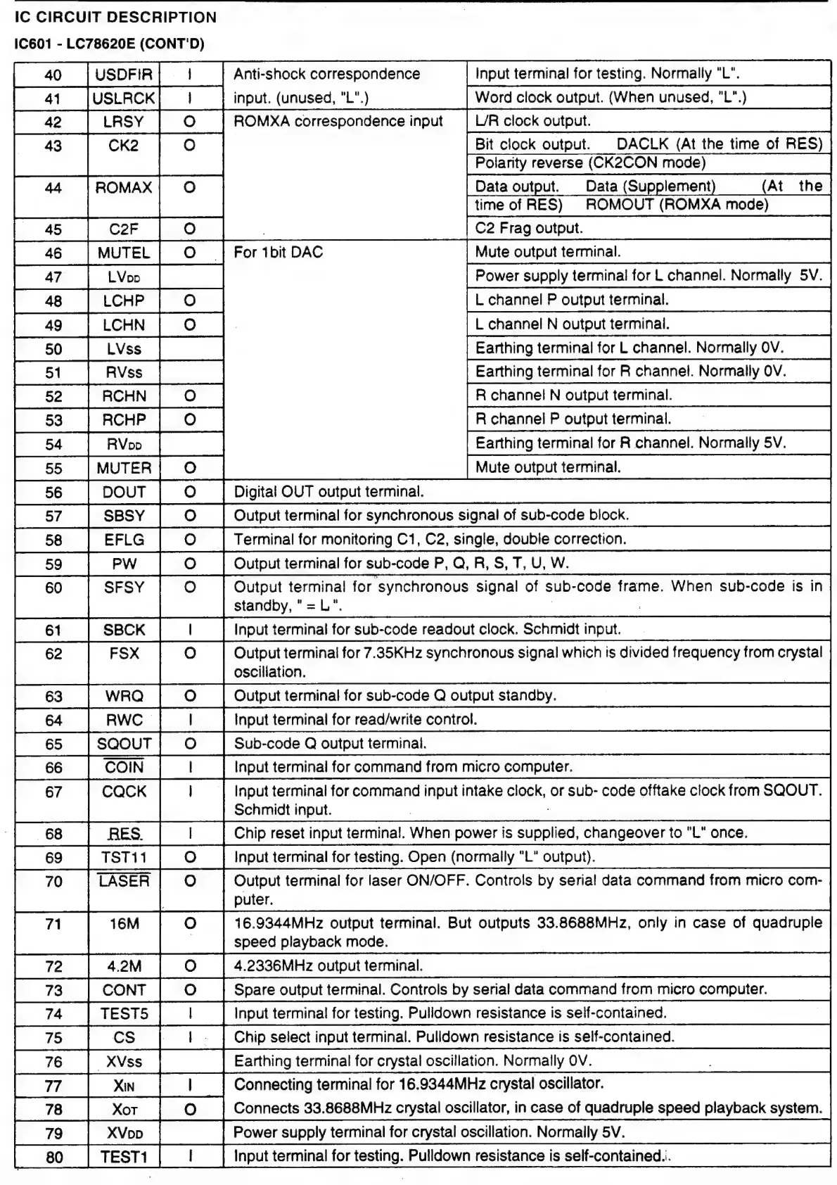 Philips 22RC026/00 - IC Circuit Descriptions (Continued); IC601 - LC78620 E Terminal Functions (Contd)