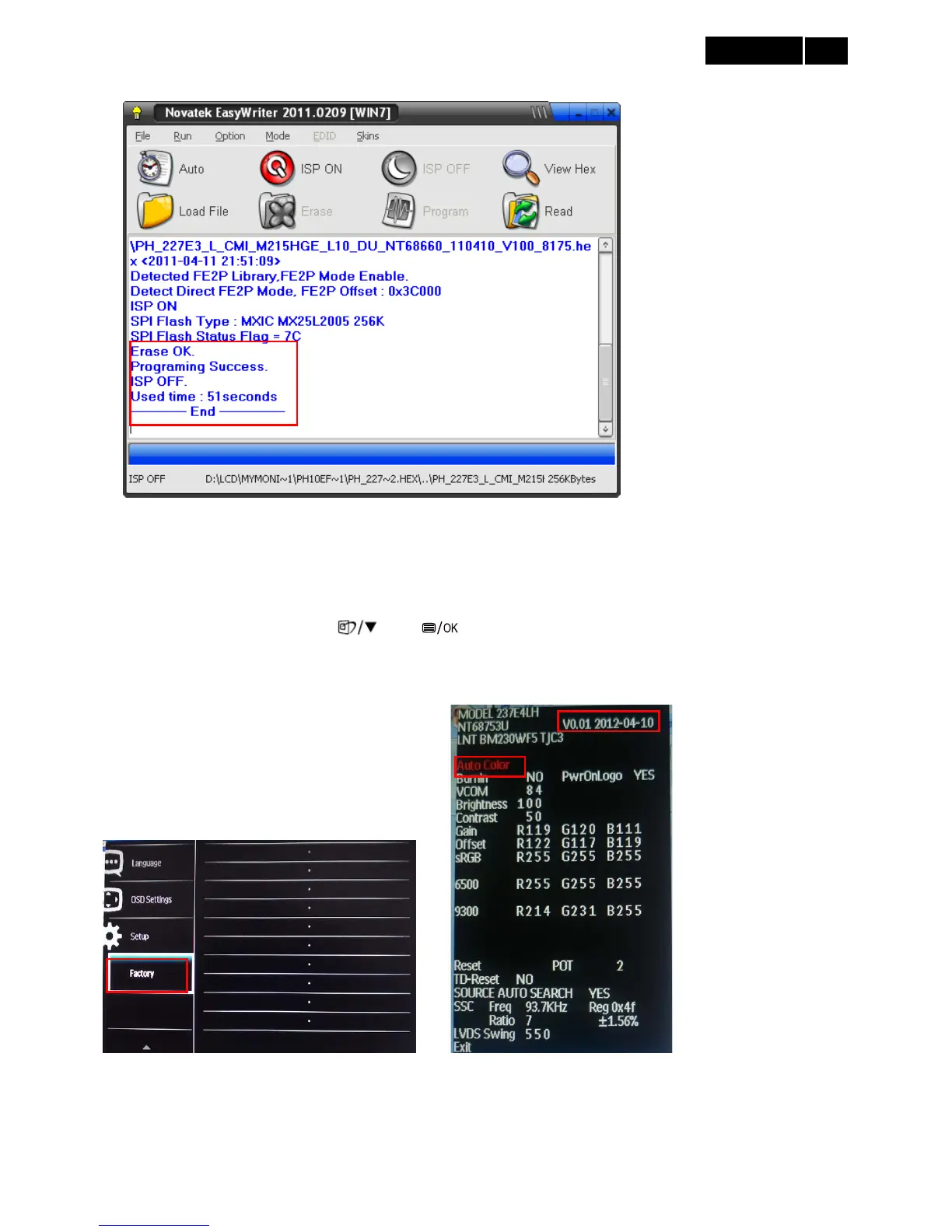 3. Select the “Factory” and press the “MENU” button to enter the factory mode. Take 237E4LH for example: