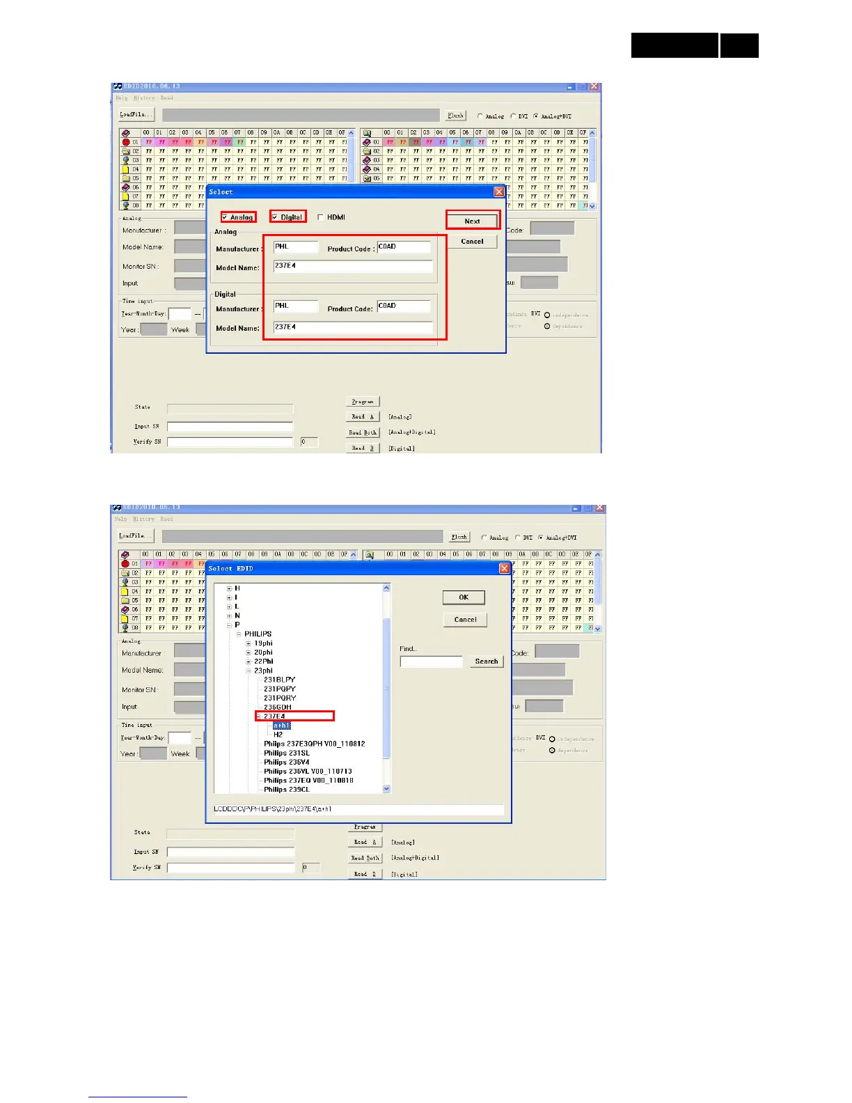 2. Select the “Philips 237E4” and then click “OK”, the tool will read the EDID information: