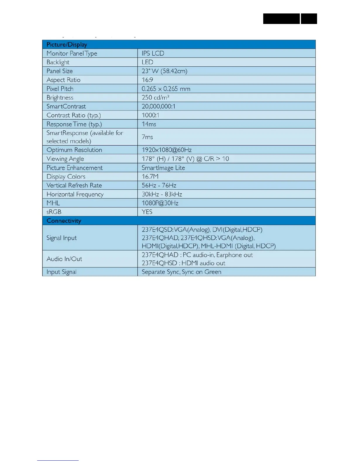 Philips 237E4QSD/93 - Monitor Specifications