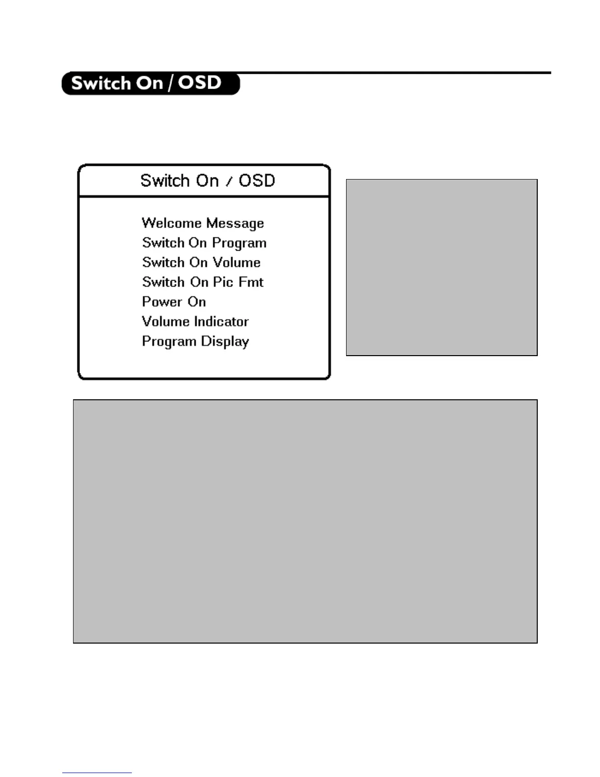 • Switch On Pic Fmt: This item sets the television’s Picture Format at switch on. Use the