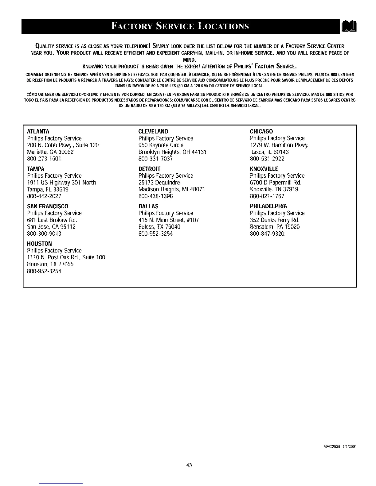 QUALITY SERVICE IS AS CLOSE AS YOUR TELEPHONE! SIMPLY LOOK OVER THE LIST BELOW FOR THE NUMBER OF A FACTORY SERVICE CENTER