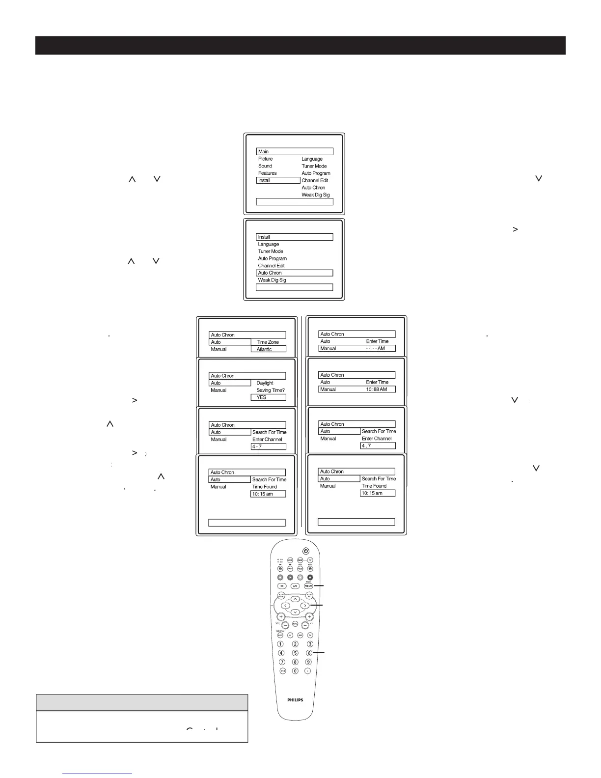 uto Chron sets the clock of the TV automatically or manually. For automatic selection, there will be queries for Time Zone, Day