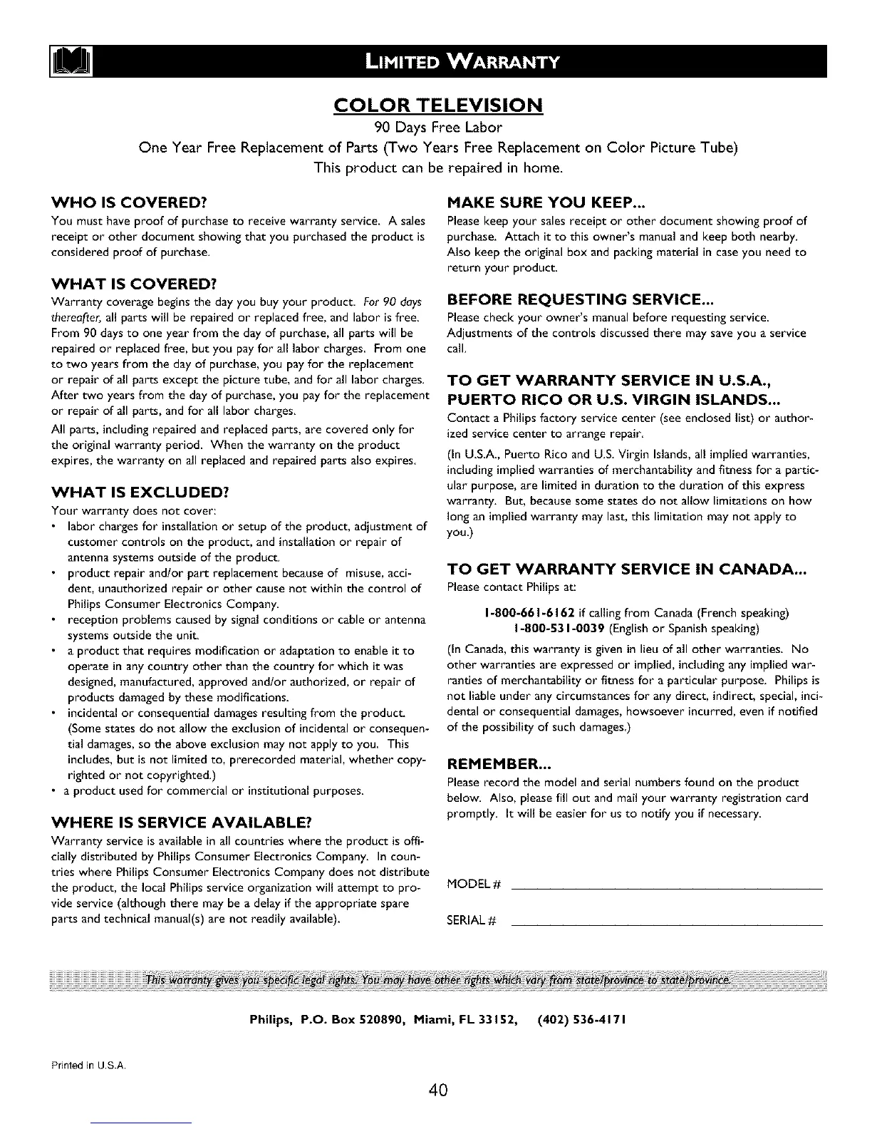 One Year Free Replacement of Parts (Two Years Free Replacement on Color Picture Tube)