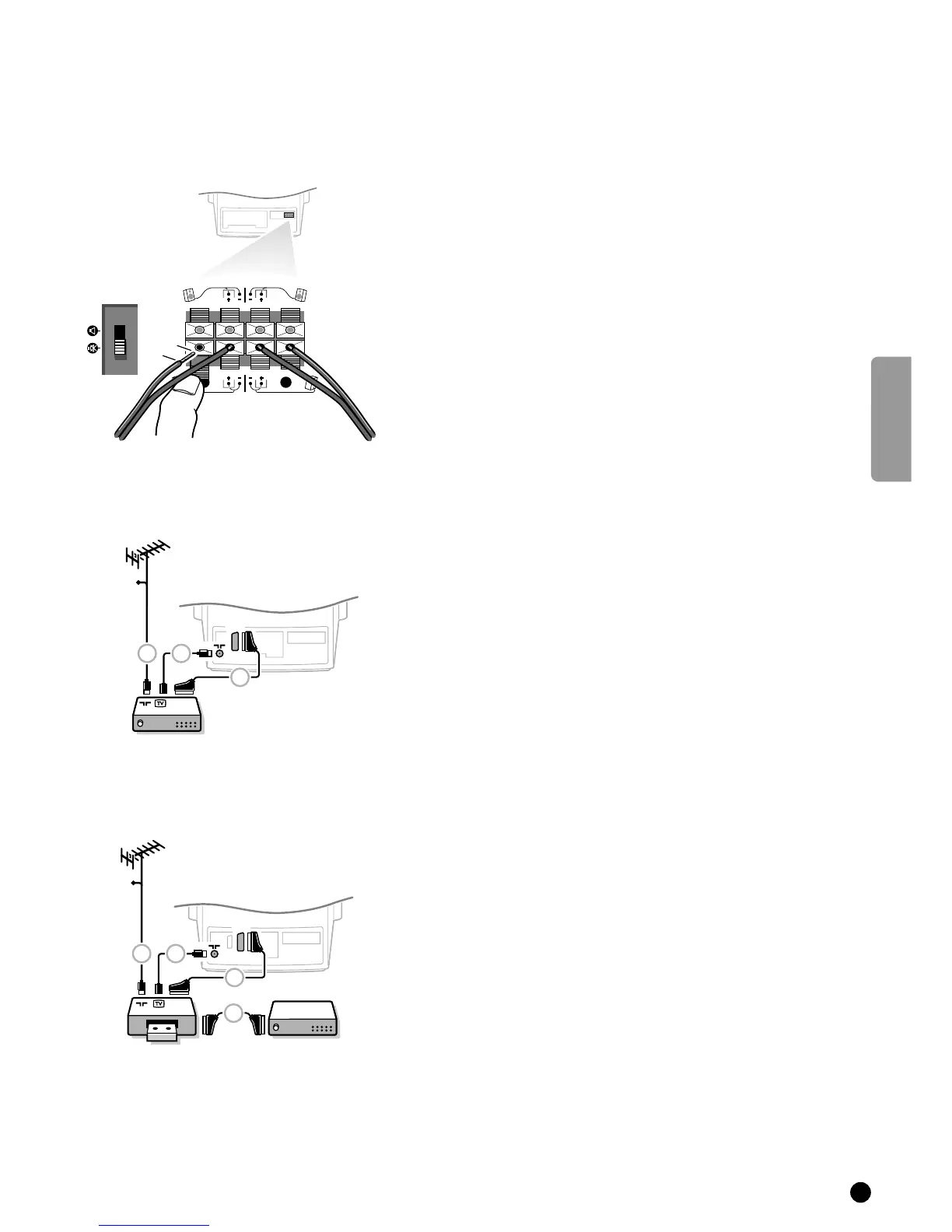 4 Connect the aerial cables 1 and 2 as shown alongside.