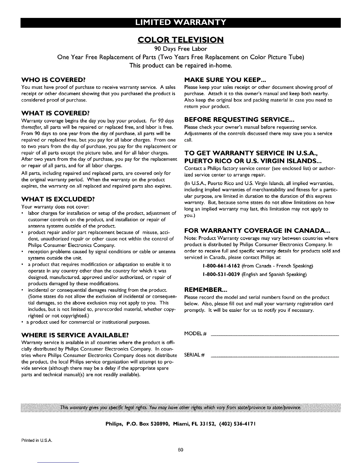 One Year Free Replacement of Parts (Two Years Free Replacement on Color Picture Tube)